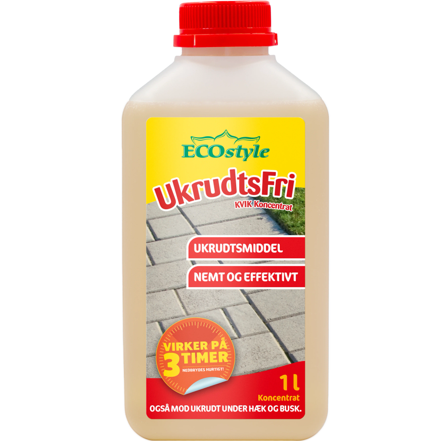 Eco Style UkrudtsFri – þykkni (concentrate) er öflugur og hagkvæmur illgresiseyðir sem er blandaður út í vatn fyrir notkun. Hann hentar vel fyrir stærri svæði þar sem þörf er á meira magni og sveigjanleika í notkun. Efninu er úðað beint á illgresið og virkar á sýnilega hluta plantnanna, sem veldur því að þær visna á stuttum tíma. Formúlan er byggð á náttúrulegum virkum efnum og er mildari kostur en mörg hefðbundin illgresiseyði. Eco Style UkrudtsFri þykkni er einfalt í notkun—blandað er samkvæmt leiðbeiningum og síðan úðað jafnt yfir illgresið, helst í þurru og stilltu veðri til að ná sem bestum árangri. Þetta er hentug lausn fyrir þá sem vilja skilvirka og hagkvæma meðhöndlun á illgresi á stærri svæðum.